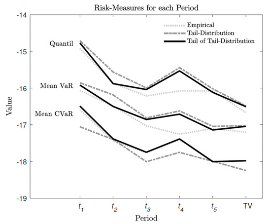 The three quantile values determined are close together and scatter only slightly in the range between EUR 14.7 and 15.0 million. The GPD specially adapted in the tail area shows very good results in the goodness-of-fit tests (Cramer von Mises test: CM = 0.0146 and pCM = 99.9%, Anderson-Darling test: AD = 0.1399 and pAD = 99.3%). This high quality can be seen in the inner figure by the close fit of the graph (black line) to the empirical data (black crosses). From the perspective of the generally high-quality requirement in risk assessment, the quantile estimated with the GPD should represent the possibility of fulfilling the requirement that also satisfies the regulatory requirements (Basel Committee on Banking Supervision 2009). The analysis described was conducted in the same way for all periods. The quantiles determined are noted in Table 7 in the top three rows and shown in Figure 4 in the top three lines. Overall, the three methods lead to similar quantile values that differ only slightly from one another within a narrow band that includes all three values. The only abnormality that can be seen is in period t4. The empirical quantile deviates more clearly from the model calculations. A detailed analysis indicates that another substructure could be concealed in the data here; compare also the almost isolated peak at approximately EUR −15.4 million in Figure A1 in Appendix A for period t4. The number of data points in this possible substructure is small, and a precise statistical analysis is not possible here.