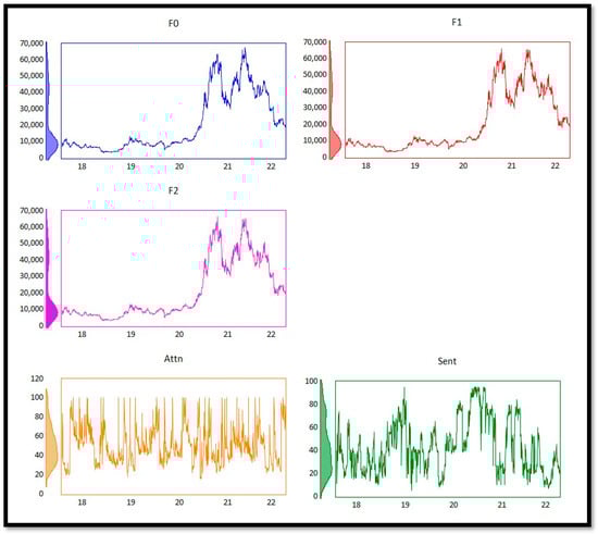 To evaluate and analyze the relations between the variables used in this study, three separate types of data with daily frequency were gathered: (1) Bitcoin futures and spot data, (2) investor attention data, and (3) investor sentiment data. The Bitcoin futures and spot data were obtained from Bloomberg. The important attention data were gathered from Google Trends (Google Search Volume Index—GSVI), which allows us to compare the relative popularity of search terms for specific time periods and regions. The unique Bitcoin sentiment data, which were based on a multifactorial crypto market sentiment analysis, were collected from the alternative.me website. The time period for which the data were gathered for the different variables used in this study spanned from 1 February 2018 to 8 September 2022. Figure 1 shows a graph of the Bitcoin spot, the two rolling Bitcoin futures, and the sentiment and attention variables through time, and Table 1 describes all the variables used in this study.