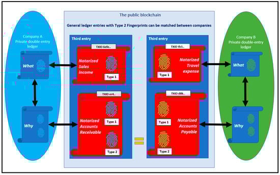 Our design is such that the third entry is created by (a) taking a unique fingerprint of a double-entry accounting posting, and (b) writing it to a shared ledger (the public blockchain), as shown in Scheme 1, then (c) by some means notifying interested parties of that fingerprint. Notification can be performed from user to user, or via an oracle.