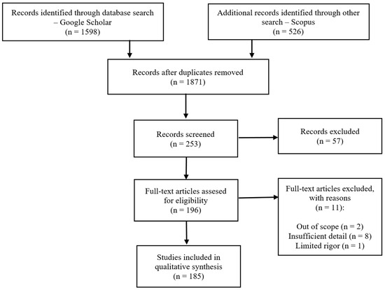 This study considered the scope of the reviewed research via the following criteria: (i) studies published before August 2023; (ii) studies published in peer-reviewed research journals; and (iii) studies written in English. Databases were used to find out previous empirical evidence, including Scopus and Google Scholar. Keywords searched in the title/abstract/keyword field in the selected database included “Voluntary IFRS”, “Voluntary International financial reporting standards”, “Voluntary adoption of IFRS”, and “Voluntary adoption of International financial reporting standards”. Furthermore, we utilize a PRISMA diagram to present our systematic reviews in a clear and comprehensive manner. A PRISMA diagram is a visual flowchart that illustrates the steps involved in the identification, selection, and exclusion of studies in a systematic review (Gates and March 2016). In Figure 1, we depict the process of identifying, selecting, and excluding studies in a systematic review of voluntary IFRS application. The initial review identified 2124 records from various sources. After removing duplicates, 1871 records were excluded. Following the screening of titles and abstracts, 253 records were excluded. Subsequent to a full-text review, 68 records were excluded. The final review comprised 185 studies.