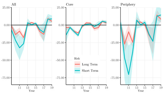 | 8 | We ran a series of robustness checks to verify whether or not the baseline results hold under different assumptions. When we winsorized the data more (5–95%, in order to avoid potential outliers), left out the CDS spreads with a maturity of 6 months (to take into account potential liquidity concerns for these short CDS contracts), or left out inverted term structures (typically in 2011), the findings were robust: expansionary monetary policy shocks were associated with a significant lowering of short-term CDS spreads and a significant steepening of the slope of the term structure. |