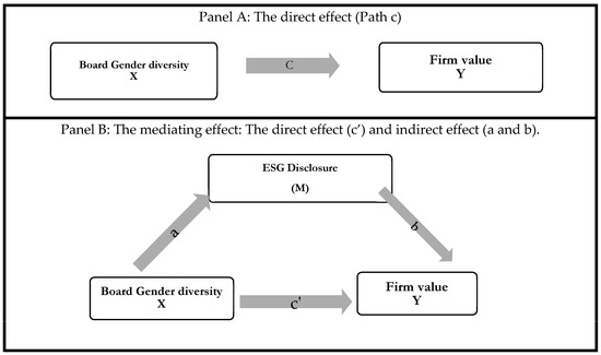 In our paper, we have three variables. The firm value represents the independent variable or Y; gender diversity is the dependent variable or X; and the ESG disclosure is the mediating variable or M. Following Salhi et al. (2020) and Alodat et al. (2023), we operationalized the mediation effect into four steps as follows.