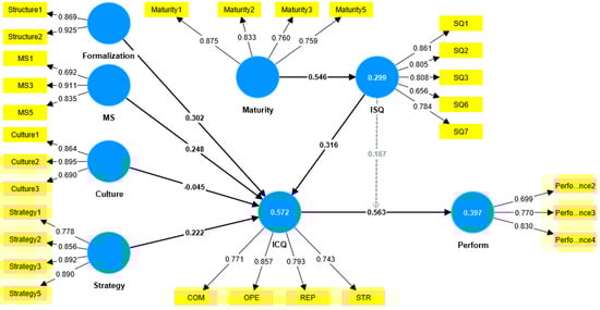 Before assessing the significance of the relationships among the study’s constructs, it is important to evaluate the outer or measurement model. First, the study removed all cases that had over 10% of missing data. Thus, six cases were removed. Second, the factor loading for each indicator was examined. All items loaded onto their respective constructs; however, eight items (ISQ4, ISQ5, Strategy 4, MS2, MS4, Maturity 4, Structure 3, and Performance 1) had factor loadings of less than 0.5, which added a few values to the model explanation; thus, these were removed (Hulland 1999; Hair et al. 2010). Table 3 shows the factor loadings of the indicators after removing low-loading factors.