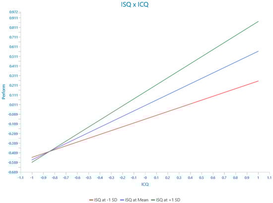 The study also hypothesized that IS quality would have a moderating influence on the relationship between IC quality and organizational performance. The moderation analysis was calculated by utilizing the PLS product indicator method. As stated by Becker et al. (2018), in a structural model, a moderator factor can influence the strength or even the direction of the relationship between constructs. Therefore, to assess the possibility of IS quality having a moderating effect, IC quality as a predictor and IS quality as a moderator were multiplied to create an interaction construct and predict organizational performance. Table 6 indicates that the estimated standardized path coefficients for the influence of IC quality × IS quality on organizational performance (β = 0.167; ρ = 0.043) were positive and significant at a level of 0.05. This indicates that the positive influence of IC quality on business performance is stronger when IS quality is at a high level, as shown in Figure 3. Therefore, H8 is supported.