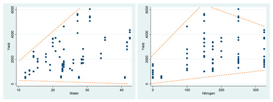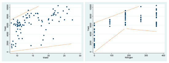 As mentioned earlier, the results reported in Table 3 are related to production variability functions and not related to production (mean) functions. In other words, the classical, theoretical conditions desired for production functions must hold for an estimation specification that represents the mean of a production process, while the functions estimated at the second stage represent the variance of a production process. Therefore, the fact that the signs of the estimated betas are negative or the magnitudes of betas are greater than one in some cases is not troubling at all in the second stage. The estimated beta coefficient () can be interpreted as the marginal effect of input i on output “variability”. As such, unlike an estimated factor share (), which is always assumed to be positive ( ) in the relevant range, estimated beta coefficients can meaningfully be positive or negative. As shown in Table 3, the marginal effect of water on yield variability for the cases of both wheat and corn in the related regions is statistically significantly positive, while the marginal effect of nitrogen use on yield variability for the cases of both wheat and corn has been estimated to be trivially negative and very close to zero.13 Our results about nitrogen’s effect are in line with that of Just and Pope (1979)’s empirical application of oats using the well-known Day dataset, in which the marginal effect of fertilizer use on oats yield variability turned out to be negative in their estimated Translog production function. The findings reported in Table 3 can be interpreted as follows. In the datasets of interest, increasing water irrigation causes the variance of output to increase, while increasing nitrogen use, on average, causes almost no change in the variance of output. When these results are compared with the actual data (through a scatterplot that depicts the relationship between the data on inputs and yield), it becomes apparent that these findings are intuitive and accurate. Figure 1 provides such visual checks.14