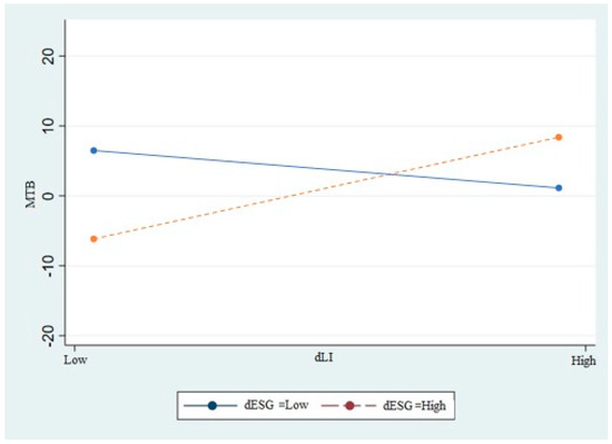 An interaction graph helps to show a graphical image of the relationship between the variables. In Figure 2, the solid line indicates a low moderating level, and the solid dash line shows a high moderating effect of the interaction variables. For all the interaction terms, ESG acts as the moderator, and LI (Figure 2) is the moderated variable. Furthermore, in Figure 2, an impact of the interaction term (i_dESG_dLI) is visible on the association between MTB and ESG. The graph implies that an increase in competition results in an increase in the ESG and FP of the pharma companies and vice-versa.