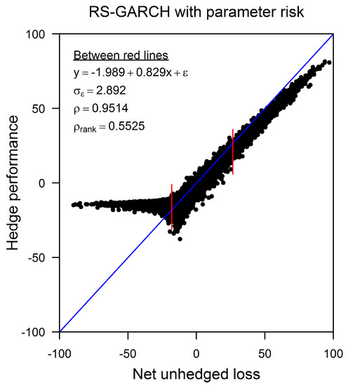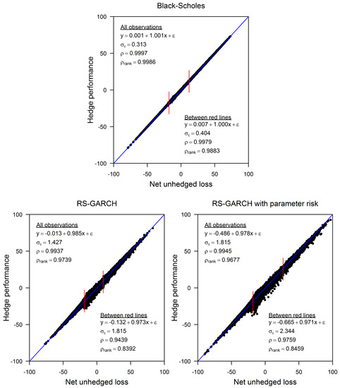 For scenarios projected with the Black–Scholes model, the correlation coefficients between the hedge performance (Y) and the net unhedged loss (X) are close to one for all observations and between the red lines. The regression relationship corresponds almost exactly to the equation , which was to be expected as the hedging strategy is constructed from the market model.