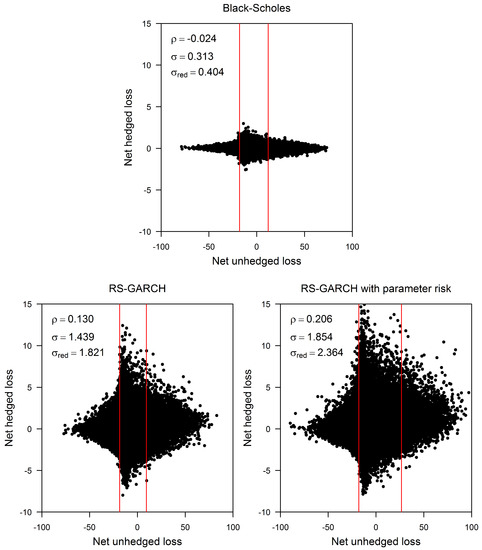 Figure 3 illustrates the relationship between the net hedged loss and the net unhedged loss for 100,000 scenarios projected under the Black–Scholes model, the RS-GARCH model and the RS-GARCH model with parameter risk. On each graph, we show (1) Pearson’s correlation coefficient between X and (), (2) the standard deviation of (), and (3) the standard deviation of in between red lines (). As before, the area in between red lines spans the 50th to 95th percentiles of the distribution for X.