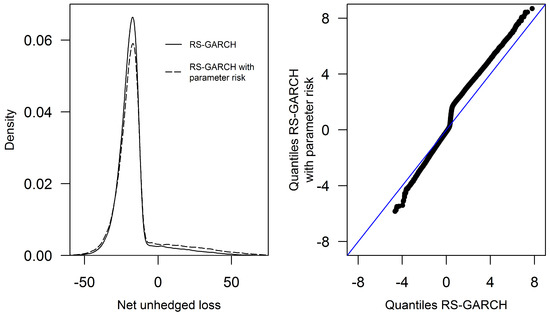 (Left panel): Empirical density of the net unhedged loss (X) based on 100,000 daily scenarios projected under the RS-GARCH model with and without parameter risk. (Right panel): Q-Q plot of standardized quantiles between these two distributions.