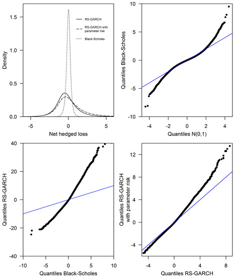 (Top-left panel): Empirical density of the net hedged loss () based on 100,000 daily scenarios projected under the Black–Scholes model, the RS-GARCH model and the RS-GARCH model with parameter risk. (Other panels): Q-Q plots of standardized quantiles comparing distributions for the net hedged loss.