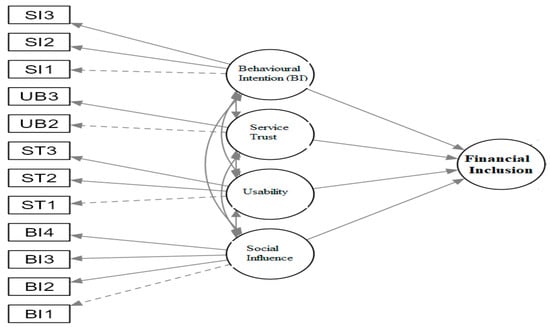 Table 4 provides the parameter estimations, including the four predictors (behavioral intention, service trust, usability, and social influence) and their impact on financial inclusion due to disruption created by the fintech companies over the last 10 years in particular. It was estimated and observed that service trust (0.3823) was the most prominent factor as it had a significant impact on financial inclusion. This means people do believe that fintech services are trustworthy and they can use them for their financial transactions. Social influence (0.2304) was the second most significant indicator of financial inclusion, although the value was not found to be significant. Behavioral intention of using fintech products was the third prominent reason, and the value was also found to be significant. Usability (0.0839) was also found to be most significant in having an impact on financial inclusion. Except for social influence, the threshold value of all the constructs was found significant.