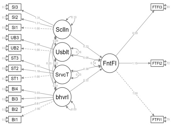 In the case of service trust, ST2 (1.183) was found to be most significant, while ST3 (0.915) was found to have less association. In the case of usability, there were only two variables, and both were found to be associated, although UB1 had stronger association compared to UB2. Social influence was the third latent variable, and SI1 (1.313) was found to be associated with its construct, while SI3 was found to be the most correlated. The last latent variable was fintech for financial inclusion, where FTFI2 was found to be strongly associated, while FTFI was less associated.