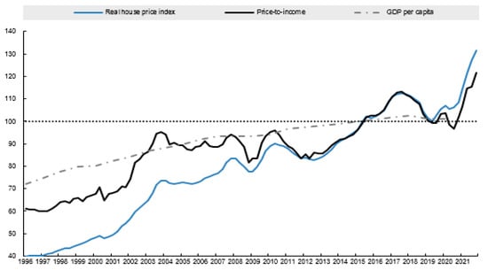 Development of Australia Housing Price, 1996–2021. Source: https://www.oecd.org/housing/data/affordable-housing-database/housing-market.htm; accessed on 3 September 2022.