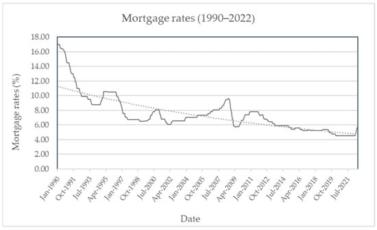 Mortgage rates (1990–2022). (Data Source: Reserve Bank of Australia, accessed on 3 September 2022). Note: Dashed line indicates that mortgage rate is on a downward trend.