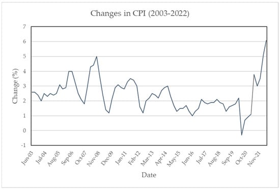 Changes in CPI (Quarterly, 2003–2022). (Data source: https://www.abs.gov.au; accessed on 3 September 2022).