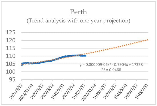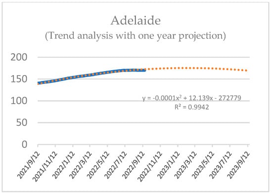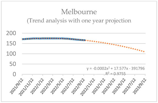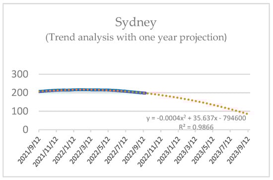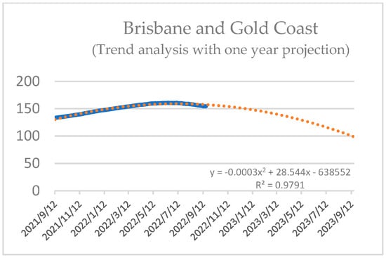 After completing the regression tests, using the data collected, trend analyses were performed on the five major cities. A one year projection was conducted, and the results are as shown in Figure 6, Figure 7, Figure 8, Figure 9 and Figure 10. From the figures below, we can see that Sydney, Melbourne, Brisbane and Gold Coast are on the downward trend, while Perth and Adelaide are trending upwards before slowing down in the second half of next year