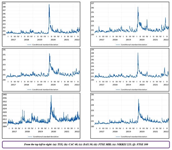 However, it is not implied that the outbreak of the war did not affect TSX, NASDAQ and USD. The ARCH and GARCH values suggested that they have also experienced a negative impact of the war, however, the pessimistic situation did not persist for a long period. When the war broke out between Russia and Ukraine, the Wall Street VIX index, which measures volatility, more than doubled from 16 to 36. The NASDAQ also dipped into the “Bear-Market Zone” and down by more than 22% (https://www.nasdaq.com/articles/ accessed on 30 June 2022). In the last week of February 2022, TSX fell down to its lowest in the last four weeks mainly because of the concerns of the investors over escalating tensions between Russia and Ukraine. However, this situation did not last over a long period (www.reuters.com accessed on 30 June 2022). As discussed earlier, the Federal Reserve of the US acted very quickly to increase the short-term interest rates to tackle inflation, which in turn boosted investors’ confidence. According to Federal Reserve officials, they increased the interest rates only because the US economy is strong, and when the country’s economy is strong, the stock earnings will also have usual growth (https://www.nasdaq.com/articles/rate-hikes-returns-and-recessions accessed on 30 June 2022).