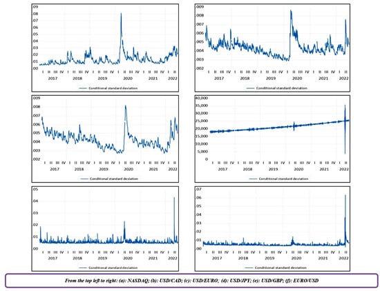 Graphical Representation of the variables (a): NASDAQ; (b): USD/CAD; (c): USD/EURO; (d): USD/JPY; (e): USD/GBP; (f): EURO/USD of G7 Countries under FIGARCH Estimation. Note: X axis measures time periods as represented by observations.