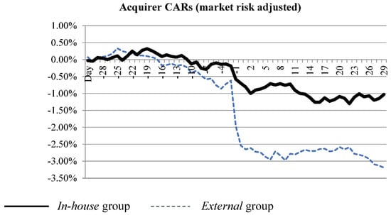 Dynamic plots of acquirer cumulative abnormal returns. The figure presents cumulative average abnormal returns to acquiring firms from trading day −30 to +30 relative to the takeover announcements. Market model parameters used to define abnormal returns are estimated using the CRSP value-weighted portfolio for days −250 to −31. The cumulative abnormal returns of the in-house group are shown in a solid line, and the cumulative abnormal returns of the external group are shown in a dotted line.