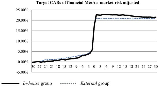 We then plot the target cumulative abnormal returns in Figure 2. The average target CARs are 20% to 25%. Unlike acquirer abnormal returns, there is no persistent difference in target abnormal returns between the in-house and the external groups.