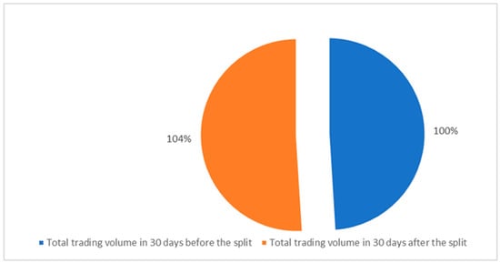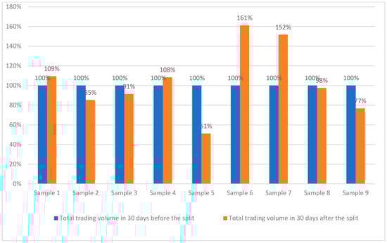 The total trading volume during the 30 days before (left column; blue online) and after (right column; orange online) the split. The total trading volume before the split is treated as benchmark (100%) in order to check the change in the total trading volume after the split.
