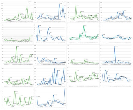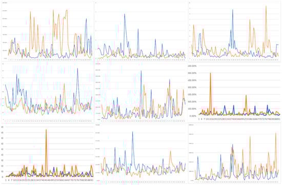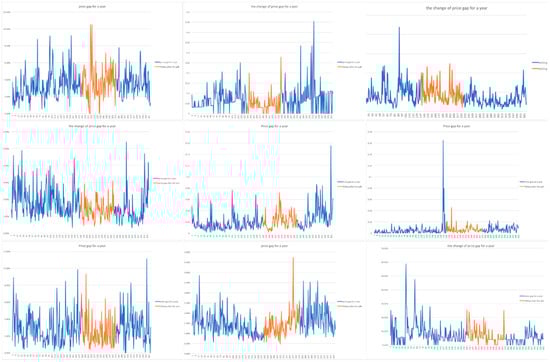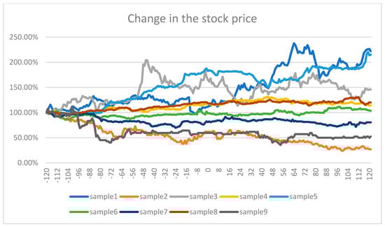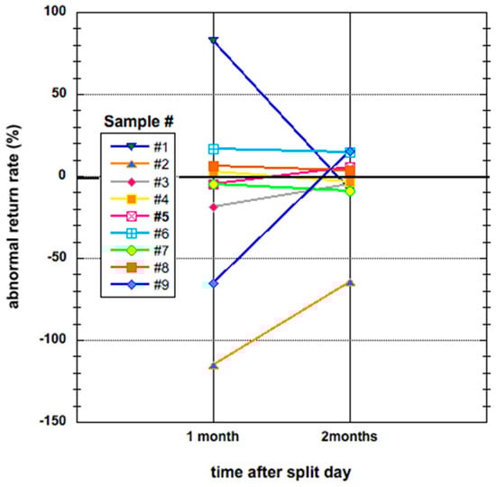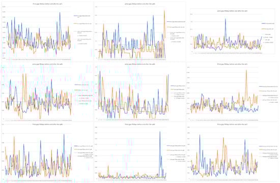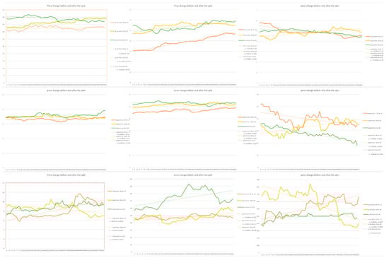 From McNichols and Dravid’s review (), one deduces that a lower range of share prices enhances the liquidity of a firm’s shares. Figure 13 shows the price gap 90 days before and 90 days after the split date—blue and yellow lines, respectively. Either from the average level or the number of high points, it can be observed that the yellow lines are below the blue lines. This indicates a good result for the firm, because a low price gap will attract investors’ consideration, be attractive to analysts for a reassessment of its value, and then affect its brand value for the public. Thus, as one of the indicators for detecting the change of the liquidity, the price gap as displayed in Figure 13, in general, provides evidence of increasing liquidity for the nine cases.