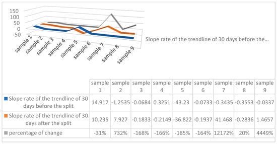 The first objective of Hypothesis 1 is to increase the number of shareholders. To increase the number of shareholders, new investors must purchase shares to become a shareholder. Therefore, the amount of trading should increase. We compare the trading volume for 30 days before and after the stock split date, to see if there is any effect in the trading volume. The amount itself does not matter in this research but the percentage change in trading volume and the trend line of trading volume are of interest. Indeed, the trend line is a tool for predicting how the investors trade in the market, and their attitudes toward shares—“Are investors more willing to hold shares than to receive dividends or sell them for cash?” In addition, the slope of trend lines measures growth rates of total trading volume () before and after the division. Comparing slope rates before and after the split, the difference between them also reflects a change of attitude. A low slope means that investors are gradually reluctant to exchange shares, whereas a high slope means that investors have an open mind toward trading orders. A significant increase in trading volume could be a sign that more people exchange their shares with others, in other words, distributing shares.