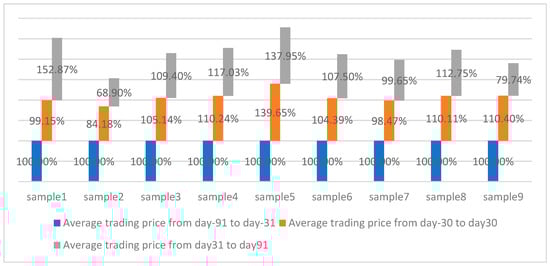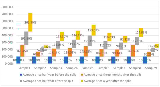 On the other hand, companies reduce the price of the share by stock split in order to attract new shareholders (). Indeed, some investors are price-sensitive (), and a low price could draw more attention. Therefore, price dropping is the second signal which a manager wants to see. To verify the finding of (), historical stock data after the stock split does show how the market responded to stock split announcements. We did gather historical stock data for about 183 days, from −91 days to +91 days. (Day 0 is the split day, −1 day marks one day before the split day, and +1 day marks one day after the split). Those 183 days (six months) are divided into three groups, every 91 days (two months) being a group. The role of the first group is to give a “normally expected” value of the stock because the first group is three months away (ahead or after) from the split day. The second group shows how the market reacts to the share diversion. There are three expected responses: decreasing, unchanged, or increasing. The third group is to measure the effect of the stock split as a short-term effect or a long-term effect.
