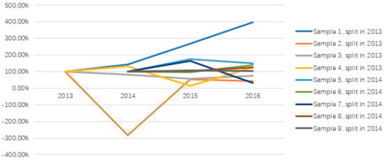 The finding is a surprise: indeed, sample 2 had the largest drop in the yearly net profit and its stock price, but sample 2 also had maximal improvement in its efficiency of maximising shareholders’ wealth. From Figure 7, Figure 8 and Figure 9, five samples (also, see Table 3) have the same changing trend in their stock prices, the yearly net profit, and the return on equity ratio. Those five samples were more likely mispriced by the market. Thus, the stock split announcement has interestingly helped the market into fairly pricing them.