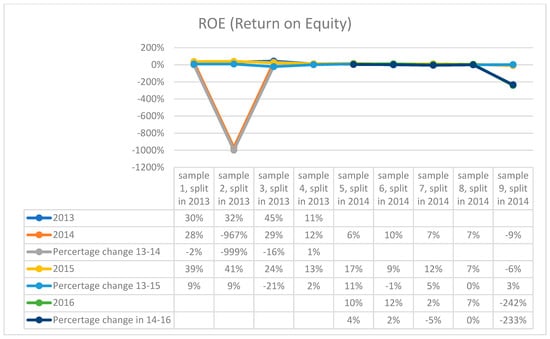 The ROE (return on equity) ratio provides a different angle for examining this hypothesis. A ROE ratio is the amount of the net income returned as a percentage of shareholders’ equity; it further relates the net profit with shareholders’ investment. The ROE ratio is a measure of how much profit a company generates with the money the shareholders have invested, and is an indicator of how well the firm is optimizing the shareholders’ wealth. Investors who invest their money into a firm are wishing and believing that the firm could efficiently use their investment. However, the table in Figure 9 shows a disappointing result. Two years after the operation, no samples had a significant improvement. The best performance is for sample 1 and sample 2; both improved their efficiency in equity by 9% only.
