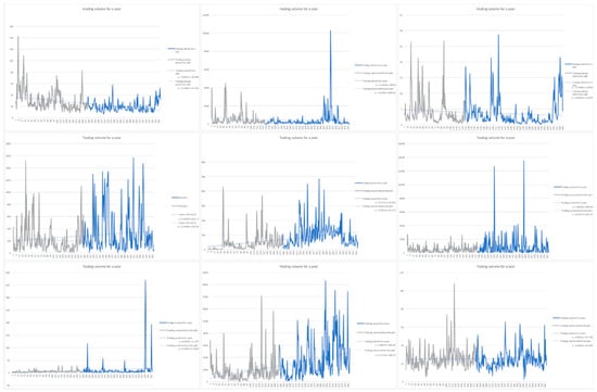 The second element to be considered is the trading volume (). In the market with poor liquidity, there are fewer trades executed every day. Under an extreme assumption, if there is a stock market with only one executive order every day, then for this stock market, the price gap is zero whenever investors test it. Hence, the trading volume, as previously displayed in Figure 3, is notably also another indicator to examine the liquidity.
