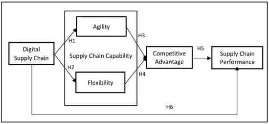 Supply chain flexibility is the capability to respond to structural changes in the supply chain process so as to adjust production and operational activities in terms of technological and environmental changes (; ). Previous studies have illustrated that digital technology is an essential element for supply chain flexibility. A study by () states that technological flexibility is a substantial capability of an organization to manage its supply chain in a dynamic and complex environment. Digital technology improves the information system capability of an enterprise, which leads to supply chain flexibility in the changing business environment. Moreover, information technology adoption in supply chain management has a great impact on the efficiency of operations and processes, accurate and reliable information, coordination, and collaboration, thus increasing supply chain flexibility (). Blockchain technology is data-based system where all stakeholders can take and share data in the supply chain network, which ensures supply chain flexibility (). Furthermore, () claim that the transformation of AI and IoT technology improves the connectivity and collaboration among the supply chain partners, which analyze a large amount of real-time data to share accurate information to enhance efficiency and supply chain flexibility. In addition, the digital technology-based supply chain has a dynamic capability to respond to an unforeseen change in a turbulent environment, as, for example, in the COVID-19 pandemic. A study by () states that digital technology asset deployment in supply chain management achieved a higher level of supply chain flexibility and performance during the pandemic. Accordingly, the following hypothesis is forwarded for testing.