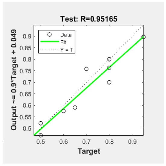 After training the neural network and completing the validation and testing, the findings fit well. The R correlation coefficient fit between output data and the target of the model was high (R = 0.951), which represents a significant positive linear relationship and allows proper prediction with relatively low error rate. Table 3 shows the sets’ structures and results after the runtime. The graph in Figure 4 was created at the end of the process runtime and shows the parameters resulting from the network.
