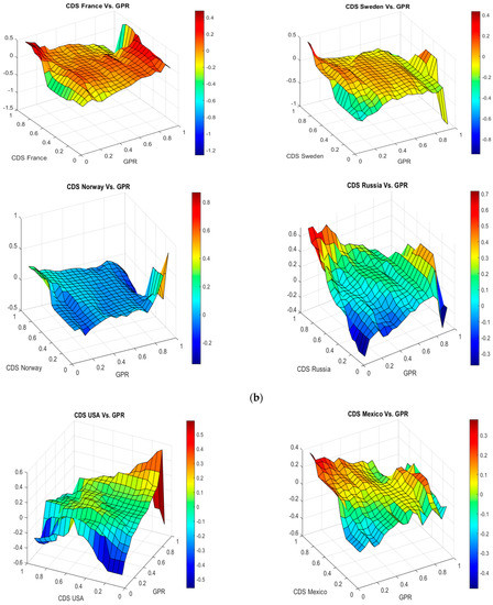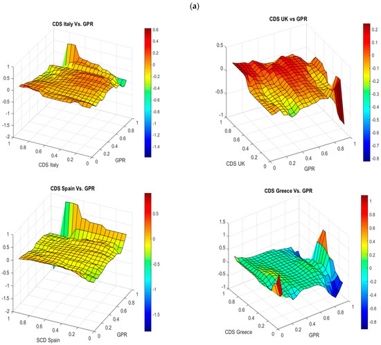 Figure 3a illustrates the GPR index’s effect on European countries’ SCDS spread returns. In the case of France, the slope coefficient ranges from −1.4 to 0.6. The impact of the GPR index on SCDS spread return is positive and stable at most combinations of quantiles of SCDS returns and positive and strong in the regions, which combine the upper quantiles of SCDS returns and the upper quantiles of the GPR index. This finding indicates that global geopolitical risk positively affects the SCDS returns in most quantiles. The positive and strong relationship is more pronounced in the extreme upper quantiles of the GPR, and SCDS returns. The impact of the GPR index on Spain’s and Italy’s SCDS spread returns are similar to the impact on France’s SCDS spread returns, and we see a positive and high relationship between the upper quantiles of GPR and SCDS returns. In the case of the UK, the slope coefficient ranges from −0.8 to 0.2. The impact of the GPR index on SCDS spread return is positive, mainly on lower and intermediate quantiles. The impact of GPR is negative and strong in the regions, which combine the lower quantiles of SCDS returns and the upper quantiles of the GPR index. The finding suggests that the GPR impact strongly and positively the UK SCDS spread returns in the lower quantiles of SCDS (when SCDS spreads are low). In the case of Sweden, GPR exhibits a negative or near-zero correlation with SCDS spreads. The negative correlation is more pronounced in the regions, which combine the lower quantiles of SCDS returns and the upper quantiles of the GPR index. In the case of Norway, we notice a negative or near-zero correlation with SCDS spreads at most quantiles but a positive relation in the areas which combine the intermediate quantiles of SCDS returns and the upper quantiles of the GPR index. In the case of Russia, the slope coefficient ranges from −0.3 to 0.7. The impact of the GPR index on Russian SCDS spread return is positive and strong at most combinations of quantiles of SCDS returns. However, we notice a negative relationship in the zones, which combine the lower quantiles of SCDS returns and the lower and upper quantiles of the GPR index. In the case of Greece, we notice a near-zero or slightly positive correlation of GPR with SCDS spreads at most quantiles. When the SCDS market and GPR are both in upper quantiles, the positive impact of the GPR regarding Greece’s sovereign credit risk is more pronounced. These findings are not aligned with Simonyan and Bayraktar’s (2022) results, who find that the geopolitical risk index is insignificant in pricing SCDS spreads of eleven emerging countries.