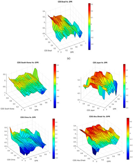 Figure 3b shows that all SCDSs for American countries (USA, Mexico, Brazil) have a mixed negative and positive relationship with GPR. The strength of these relationships varies across quantiles. The GPR positively and strongly impact the SCDS in Mexico and Brazil when the SCDS is in upper quantiles. The negative relationship is more pronounced in the case of the USA, where both the SCDS and GPR are in a lower quantile. However, we observe a positive relation in the regions, which combine the lower quantiles of SCDS returns and the upper quantiles of the GPR index. These findings show that emerging countries (e.g., Mexico and Brazil) with moderate sovereign wealth funds are more sensitive to the increase of the geopolitical risk.