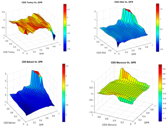 This section investigates the asymmetric co-movement between GPR and SCDSs using QQA for nineteen countries. Figure 3 shows the slope coefficient estimate, which catches the influence of the τth quantile of GPR returns on the θth quantile of the SCDS returns, at various values of and .