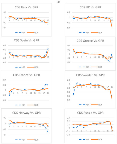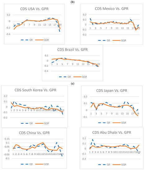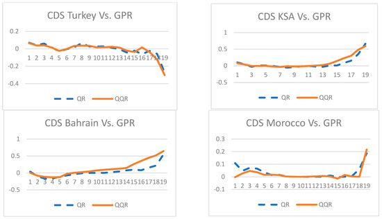Figure 4 shows that the average QQA estimates of the slope coefficients have almost the same behavior as the QR estimates for all the SCDSs. Therefore, Figure 4 validates our previous findings of the QQA since the charts indicate that the average QQA estimates of the slope coefficients have approximately the same behavior as QR estimates for all variables. Figure 4 supports our initial finding, as given in Figure 3. In addition, Figure 4 confirms that the effects of GPR on SCDSs were heterogeneous, mainly positive, asymmetric, and varied across quantiles and countries.