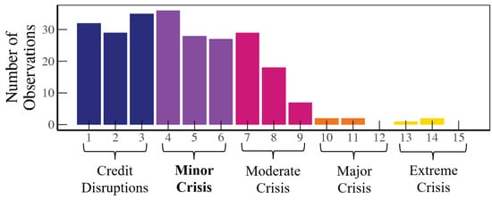 Figure 2, they develop definitions for five types of financial distress increasing in severity: credit disruption, minor crisis, moderate crisis, major crisis, and extreme crisis. Each category is assigned a minus, normal, or plus. Thus, their final numerical scale ranges from 0 to 15. This constitutes a more continuous measure of crises. Their crisis definitions are provided below: