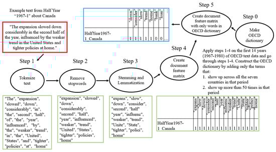 The OECD dictionary was created from the raw OECD text from 1967 to 1980, allowing us to create a dictionary of words entirely void of any time leakage, which we then followed throughout the training and testing sets. There are seven countries available during the 1967 to 1980 period: Canada, France, Germany, Italy, Japan, United States, and the United Kingdom. When creating our dictionary, we required that a term be present across these seven countries during this time period to avoid including country-specific words in the text. In addition, we required that the tokens be mentioned at least 50 times over the entire time period across all countries, in order to remove infrequent or misspelled words along with words very specific to a single document. This provided us with a list of terms, from which we manually removed four types of terms: (1) references to time (“year”, “summer”, “January”), (2) units (“percent”, “billions”), (3) section pointers (“outlook”, referencing OECD Economic Outlooks, “source”), (4) common typos (“tion”, “ing”, as words are often split and these common endings may be picked up as unique terms).