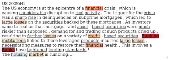 2017) look for the terms “crisis”, “dire”, “grave”, “unsound”, and “paralysis” in reference to the financial system in order to classify this level; references to major government interventions contribute to a severe rating as well.