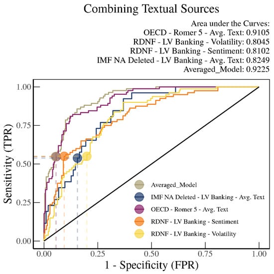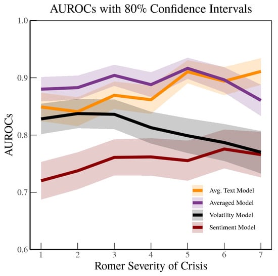 2017) crises. The RDNF sentiment seems to provide a lot of information as well, with the added benefit of access to a broader set of countries. While IMF Article IVs have inconsistent frequency, they clearly add information due to their relevance in writing about financial stress or financial crises. A naive combination of sources shows potential improvements over individual text sources. Finally, text data appear to provide statistically significant improvement over a baseline model with just volatility, especially for detecting more severe types of crises.