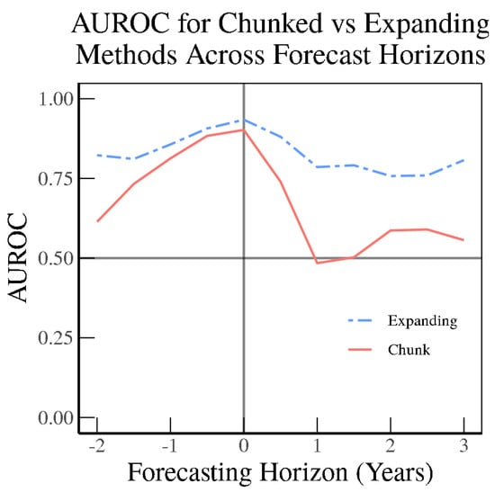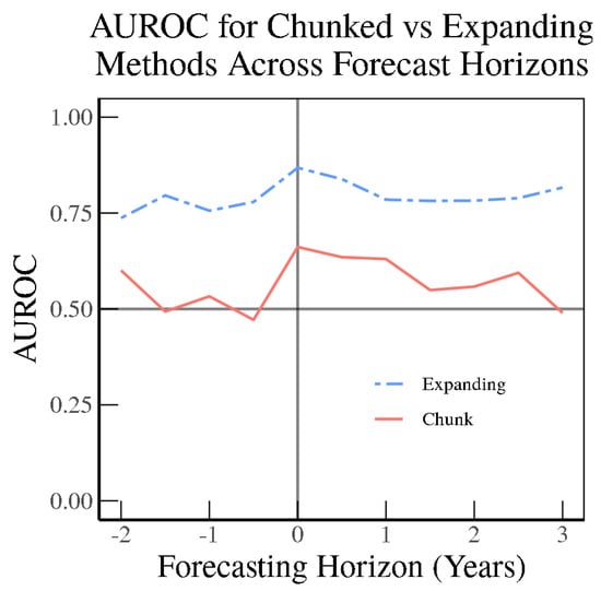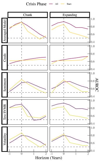 Figure 21 illustrates that the Sentiment, SVM, Volatility, and Averaged Model all perform better at nowcasting the onset of crises compared to backcasting and forecasting, and struggle the most in forecasting the exact timing of the onset of a crisis, especially at a distance of one to two years out. On the other hand, the Credit Models perform relatively better in forecasting crises one or two years out, whether using the chunk method or the expanding method, with an AUC of between 0.60 and 0.80 compared to other models. The Credit Models perform the best out of all the models at forecasting the onset of crises two years out. One possible explanation for these models performing better at this forecasting horizon is that credit-to-GDP is more predictive at longer horizons, while models that include OECD text or volatility capture more contemporaneous or backward-looking information. The OECD text may especially capture more backward-looking information, with the text SVM model performing the best at backcasting the onset of crises.