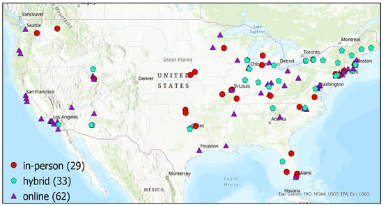 Universities were also affected by stay-home orders, and teaching started to shift online in mid-March 2020. This probably resulted in most students returning home and stopping paying rents for their residence near school. The Current Population Survey specified that more young adults (18–29) lived with their parents or relatives in May 2020 compared to May 2019. This could then have led to decreases in housing demand and house prices neighboring universities. After the first-round stay-home orders started, different universities adopted different teaching modes in the study period (May to October 2020), ranging from full and primarily online, hybrid, to full and primarily in-person. The distribution of the universities by teaching modes is shown in Figure 1, which shows that most universities adopted online teaching. The variation in the effects of proximity on house prices since the COVID outbreak is then studied in the article. Another channel through which the COVID outbreak affected student numbers living nearby universities is that, after the outbreak, international student enrolment dropped significantly (Thatcher et al. 2020). According to my best knowledge, limited research has studied the effect of proximity to universities on nearby house prices and almost none of the literature has analyzed those effects since COVID-19.