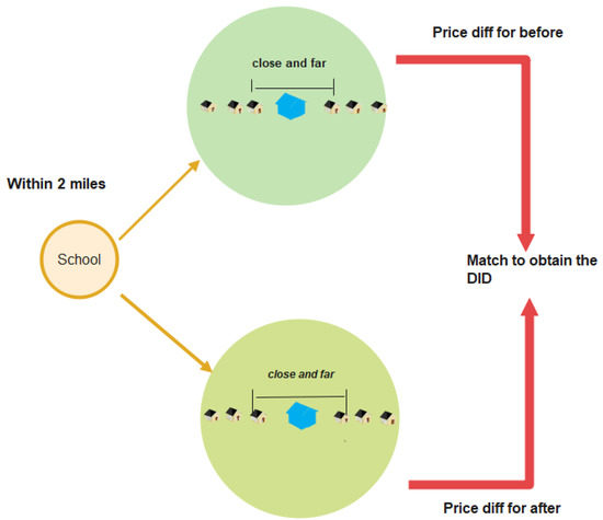 A non-parametric difference-in-differences method, developed by Diamond and McQuade (2019), improves the ring method in two important aspects. First, they managed to keep the properties used for comparison as similar as possible by choosing properties within close proximity. The locational proximity makes those properties similar in their neighborhood features and local time trends in house prices that can be crossed out when considering their price differences. Second, the non-parametric method generates the net effect as a continuous function of distance to the university and time since the COVID outbreak. Specifically, since the house price comparison is performed at numerous distances to the university and for multiple months since the outbreak, a smooth function of the price difference with respect to distance and time can be recovered by non-parametrically smoothing the price difference to distance and time. Figure 2 illustrates the method, and the details of the method are outlined below.