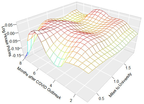 Figure 3 shows the results from the non-parametric estimations. These are three-dimensional surface results that are continuous with respect to both distance in miles from the school and the number of months after the COVID outbreak. The results thus show the detailed variation in the effect of proximity to universities on house prices after the COVID outbreak. The COVID outbreak month is taken as February of 2020. Then, a number of 2 on the axis of “Months after COVID Outbreak” shows the effect for 2 months after the outbreak, that is, April of 2020. This is when the offer was made as opposed to when the transaction was closed. Normally, the transaction takes about one month and a half to complete. An effect of 5% for month 2 since the outbreak and 1 mile to the university reflects that the houses located at 1 mile from the school were sold for 5% more than houses located a little further away in April 2020. This is the net effect of being 1 mile from the school for 2 months after the pandemic.