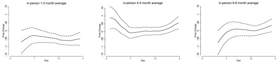 The results show that all three types of universities experienced house price declines with approximately similar magnitudes in months 1–3. This is reasonable since, in these three months, regardless of the teaching modes, universities were shut down. For months 4–5, a variation in the effects is detected, in that the in-person and hybrid schools had a larger increase in house prices than the online schools. This is intuitive, since in-person schools perform face-to-face class meetings, and students who formerly live close continue to live nearby. Hybrid teaching combines in-person and online teaching that still needs students to go to classes from time to time. This explains the similarities in the effects between in-person and hybrid schools. For months 6–8, there is also a universal decrease in house prices nearby the school, and online schools experienced a larger decline.
