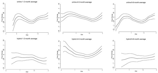 Next is the discussion on the effect variations by teaching modes of in-person, online, and hybrid. The teaching modes are for May to October 2020. The effect of proximity to universities on house prices relies on the fact that the housing market neighboring universities is heavily influenced by college students. If they do not need to go to classes in person, they do not need to live close to school. Therefore, different teaching modes might lead to differential effects of proximity to universities on house prices following the outbreak of COVID-19. Figure 4 shows the effects. Since the effects need to be compared by teaching modes and 3-D format results make it hard to discern the differences, the results are shown in a 2-D format where the effects are averaged over different months and shown as continuous over distance to the school. The effects and 90% confidence bounds are shown in the figures.