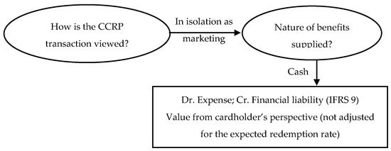 The contra-entry for the financial liability will be an expense, recognised when the direct cash back reward is granted (Brink 2017b). The financial liability would subsequently be measured at amortised cost but, as the direct cash back is payable on demand, no adjustments in terms of the effective interest method would be necessary (Brink 2017b). Figure 2 illustrates the accounting treatment of a CCRP transaction viewed as a marketing tool when the nature of the benefits is cash (to be incorporated into the CCRP theoretical model).