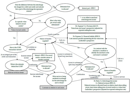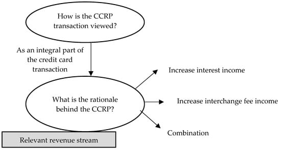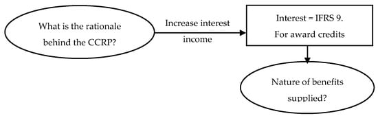 When management views the CCRP award credits as an integral part of the credit card transaction, the CCRP transaction forms part of a bigger revenue transaction (Brink 2022). It is therefore crucial to identify this relevant revenue transaction (revenue stream) to determine whether the transaction falls within the scope of IFRS 15. There are three possible revenue streams to consider in a CCRP transaction, namely the interest on the credit card loan, the interchange fee income, or a combination of the above. The relevant revenue stream can be identified with reference to the rationale behind the CCRP that gives rise to the CCRP transaction (Brink 2017b). To provide for the three possible revenue streams, the following question can be asked in the CCRP theoretical model (as illustrated in Figure 3):