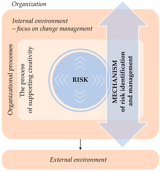 In the text above, the aspects related to the risks affecting the organizations were presented. All the main aspects with their mutual connections are shown graphically (Figure 1). The graphic form captures the impact of risk on organizational processes with a focus on the creativity supporting process. Furthermore, the mechanism of risk identification and management was included, which can also be used within the process of managing changes that are constantly present in the internal environment of organizations. Subsequently, the negative impacts of potential or currently active risks can be minimized, and the effective risk management of organizations in the market environment leads to their progress and a positive impact on the country’s economy.
